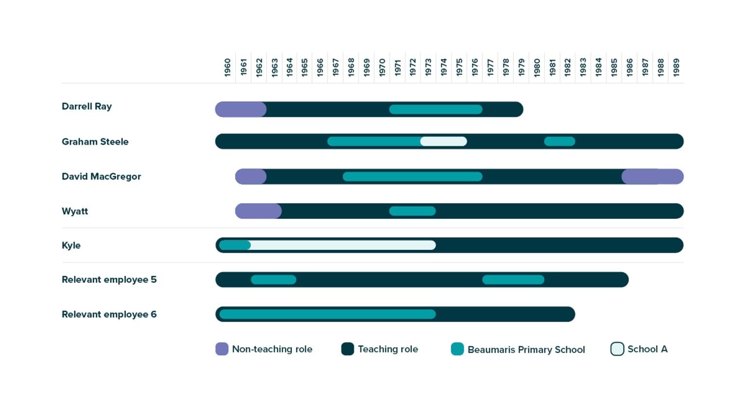 In practice, the effect of these requirements is that the teaching history of Mr Ray, Mr Steele, Mr MacGregor and Wyatt dictated which other government schools came within scope. Essentially, it obliged the Board of Inquiry to follow the careers of these four relevant employees through to 1999. The Board of Inquiry relied on the Department to confirm information about the government schools where each relevant employee worked (including their role and length of service).