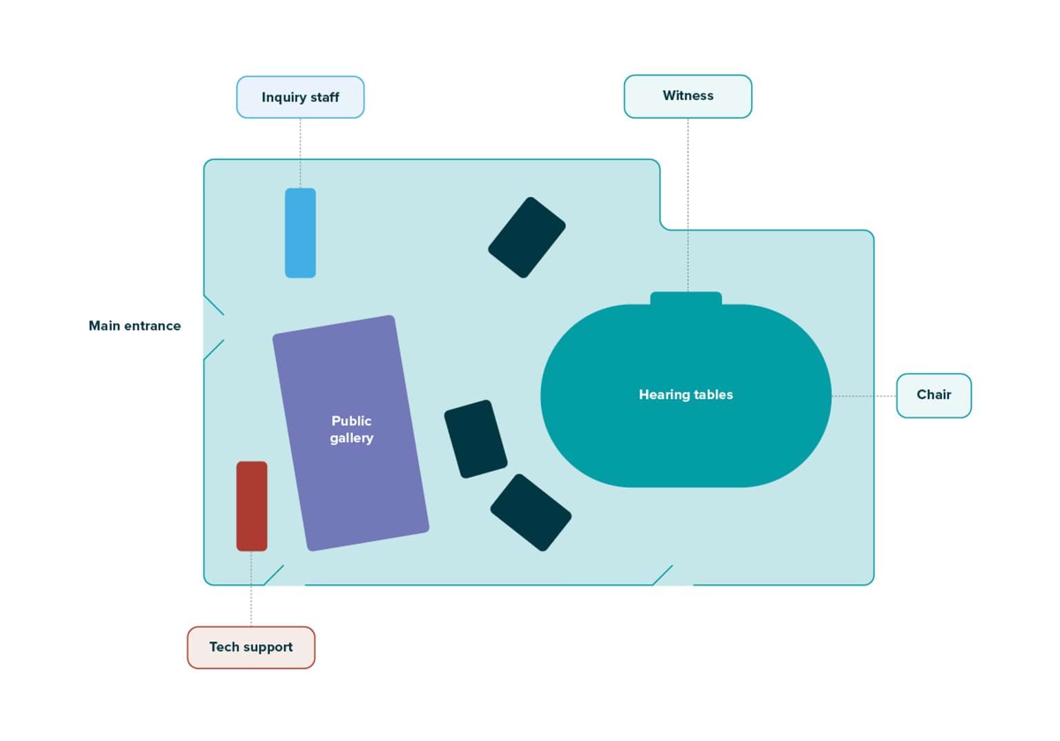 - hearing tables — where the witness, the Chair of the Board of Inquiry, and legal personnel including Counsel Assisting will be seated